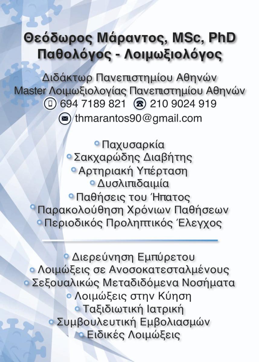ΘΕΟΔΩΡΟΣ ΜΑΡΑΝΤΟΣ MD, MSc, PhD - ΙΑΤΡΟΣ ΠΑΘΟΛΟΓΟΣ ΝΕΟΣ ΚΟΣΜΟΣ ΑΘΗΝΑ -ΛΟΙΜΩΞΙΟΛΟΓΟΣ ΝΕΟΣ ΚΟΣΜΟΣ ΑΘΗΝΑ