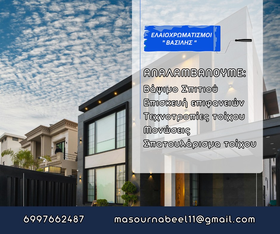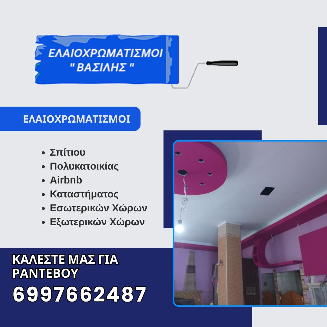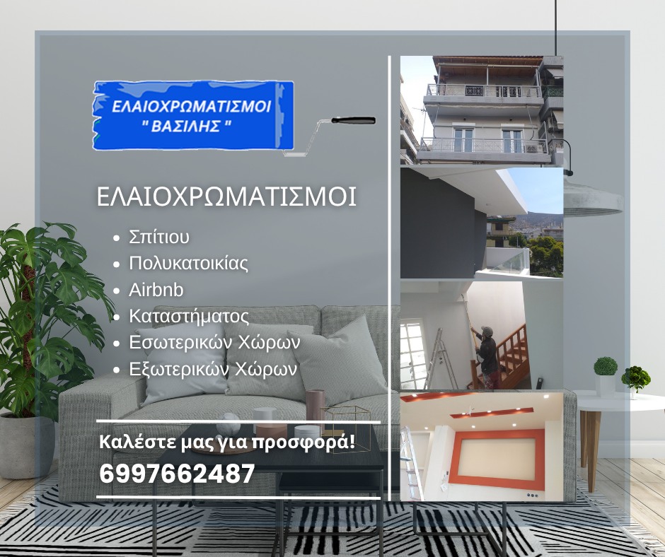 Δραστηριοποιούμαστε στο κλάδο πάνω από 20 χρόνια. Αναλαμβάνουμε τον Ελαιοχρωματισμό, Εσωτερικών και Εξωτερικών χώρων σε όλη την Αττική.